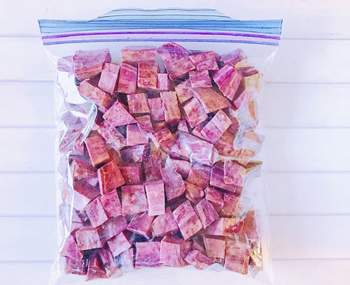 煮粥或者煮飯時加幾塊紫薯進去味道會更加好吃,但通用我們一次不會用到一大顆紫薯,因此剩下的紫薯要切塊放冷…